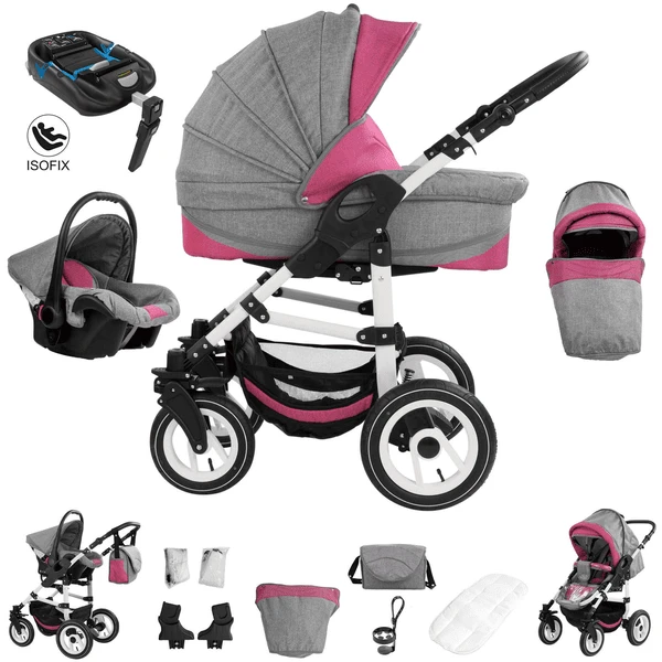 Bebebi Florenz | 4 in 1 Kinderwagen Komplettset | ISOFIX Basis | Hartgummireifen Davanzati Pink White