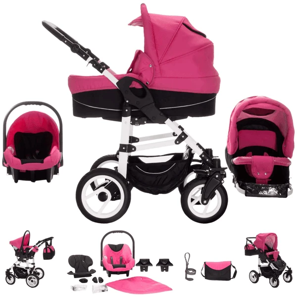 Unser BEBEBI® PARIS 3 in 1 Kinderwagenset besteht aus: Babywanne, Sportwagen, Autositz, Gestell & Zubehör. Die Aufsätze können individuell in beide Richtungen (also in UND gegen die Fahrtrichtung) auf das Gestell gesetzt werden. Die Schwenkräder sorgen für eine besonders gute Manövrierfähigkeit in der Stadt. Die Stoßdämpfer und die Härteverstellung im hinteren Bereich machen den PARIS besonders geeignet für Ausflüge auf unwegsamen Böden, im Gelände und sogar auf Splitt!Details KinderwagenaufsatzIn Fahr- & gegen Fahrtrichtung montierbar verstellbare und abnehmbare SonnenhaubeKomfortpolsterung des Innenraums aus kuschelweicher Baumwolleergonomischer, in die Sonnenhaube integrierter TragegriffFußabdeckung inklusiveDetails Autositz ECE R 44 / 04 (Prüfsiegel)zugelassen für den Straßenverkehr nach § 21 der StVOverstellbarer Sonnenhaubegepolsterter 3-Punkt-Sicherheitsgurt; 2-fach in der Höhe verstellbarstufenlose Einstellung des Gurtumfangs möglichBezug handwaschbar, da komplett abnehmbarDetails BuggyIn Fahr- und gegen Fahrtrichtung montierbarverstellbare Sonnenhaube mit verschließbarem AußenfachMehrstufig verstellbare RückenlehneSchlafposition möglichverstellbare Fußablage mit SchutzbezugGepolsterter 5-Punkt SicherheitsgurtAbnehmbarer Sicherheitsbügel (Rausfallschutz) Details Gestelläußerst stabiles Gestell aus einer Aluminium/Stahl-LegierungKomfort-Fahrwerk mit regelbarer FederungVorderräder: ca. 24 cm und um 360 Grad schwenkbar; inklusive Feststellfunktion Hinterräder: ca. 30 cmLeichtgängige Sicherheitsbremsebesonders angenehmer Soft-Touch-Schiebegriff; mehrfach höhenverstellbar (s.Oben)geräumiger und abnehmbarer Einkaufskorb unter den Aufsätzen