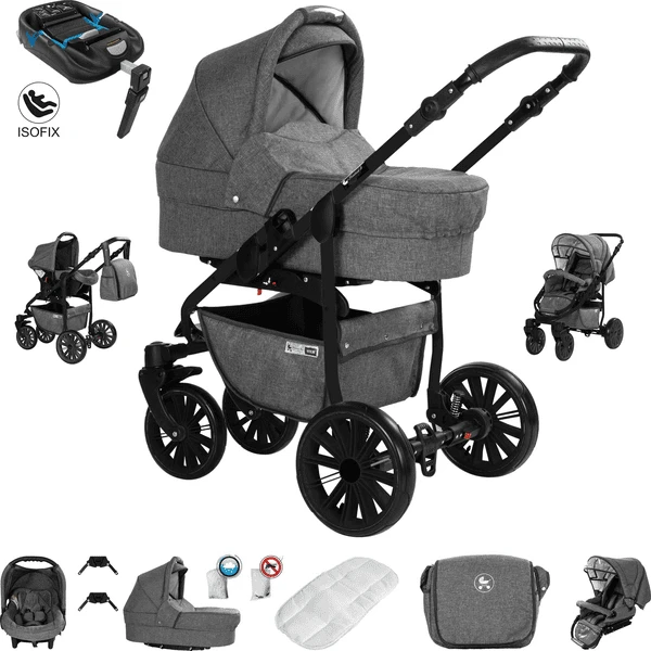 Friedrich Hugo Berlin | 4 in 1 Kinderwagen Komplettset | ISOFIX Basis | GEL Reifen Grey and Grey Night
