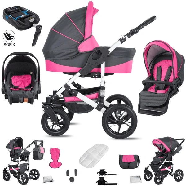 Friedrich Hugo Hamburg | 4 in 1 Kinderwagen Komplettset | ISOFIX Basis | Hartgummireifen Grey & Pink