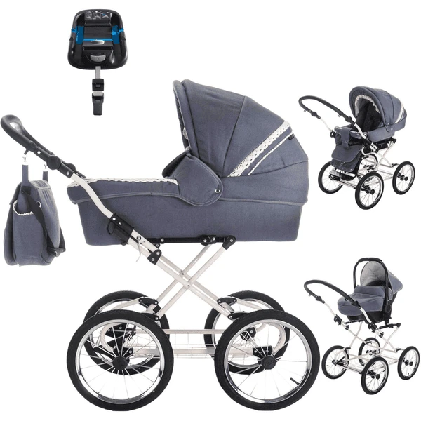 Unser FRIEDRICH HUGO ® NATURELINE UNI 4 in 1 Kinderwagenset besteht aus: Babywanne, Sportwagen, Autositz inkl. ISOFIX Basis, Gestell & Zubehör. Die Aufsätze können individuell in beide Richtungen (also in UND gegen die Fahrtrichtung) auf das Gestell gesetzt werden. Dank der 14 Zoll Räder ist dieser Kinderwagen auf jedem Untergrund der ideale Begleiter. Die Stoßdämpfer machen den NATURELINE UNI besonders geeignet für Ausflüge auf unwegsamen Böden, im Gelände und sogar auf Splitt!Details KinderwagenaufsatzIn Fahr- & gegen Fahrtrichtung montierbar verstellbare und abnehmbare SonnenhaubeKomfortpolsterung des Innenraums aus kuschelweicher Baumwolleergonomischer, in die Sonnenhaube integrierter TragegriffFußabdeckung inklusiveDetails Autositz ECE R 44 / 04 (Prüfsiegel) inkl. ISOFIX Basiszugelassen für den Straßenverkehr nach § 21 der StVOInkl. Fußabdeckung & verstellbarer Sonnenhaubegepolsterter 3-Punkt-Sicherheitsgurt; 2-fach in der Höhe verstellbarstufenlose Einstellung des Gurtumfangs möglichBezug handwaschbar, da komplett abnehmbarDetails BuggyIn Fahr- und gegen Fahrtrichtung montierbarverstellbare Sonnenhaube mit verschließbarem AußenfachMehrstufig verstellbare RückenlehneSchlafposition möglichverstellbare Fußablage mit SchutzbezugGepolsterter 5-Punkt SicherheitsgurtAbnehmbarer Sicherheitsbügel (Rausfallschutz) Details Gestelläußerst stabiles Gestell aus einer Aluminium/Stahl-LegierungKomfort-Fahrwerk mit regelbarer FederungRäder: ca. 38 cmLeichtgängige Sicherheitsbremsebesonders angenehmer Soft-Touch-Schiebegriff; mehrfach höhenverstellbar (s.Oben)geräumiger und abnehmbarer Einkaufskorb unter den AufsätzenDer Versand erfolgt in 2 Paketen